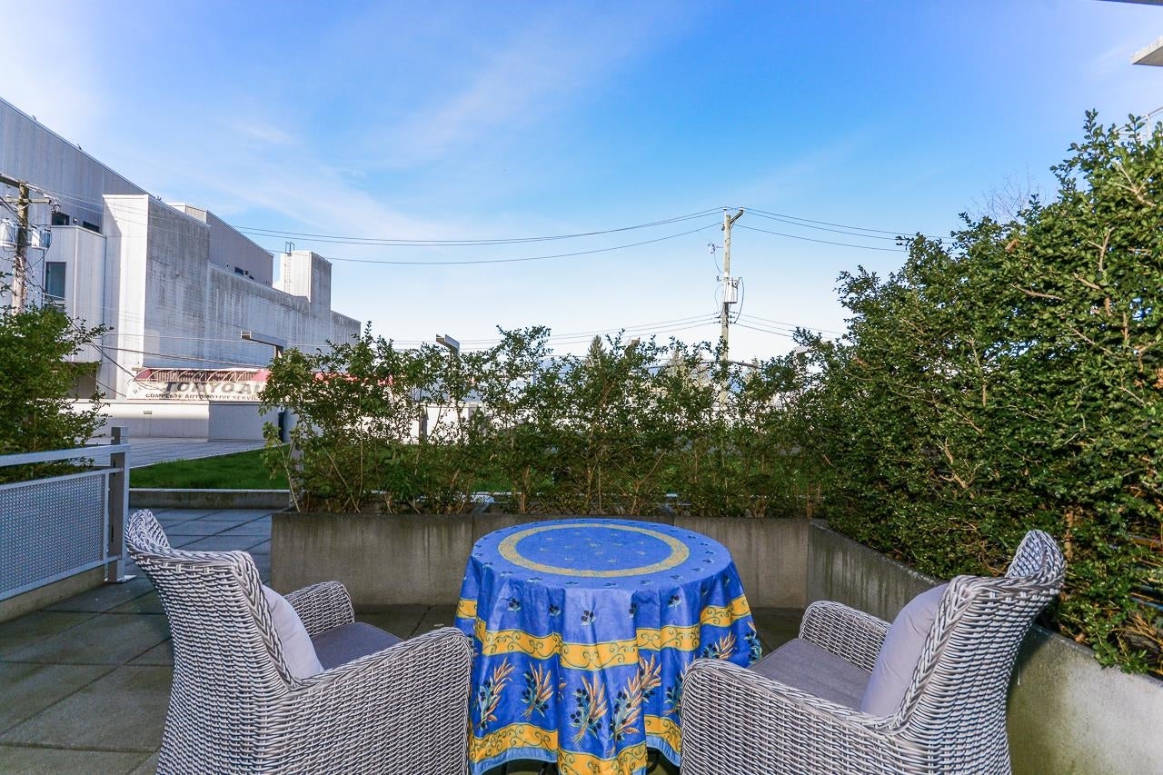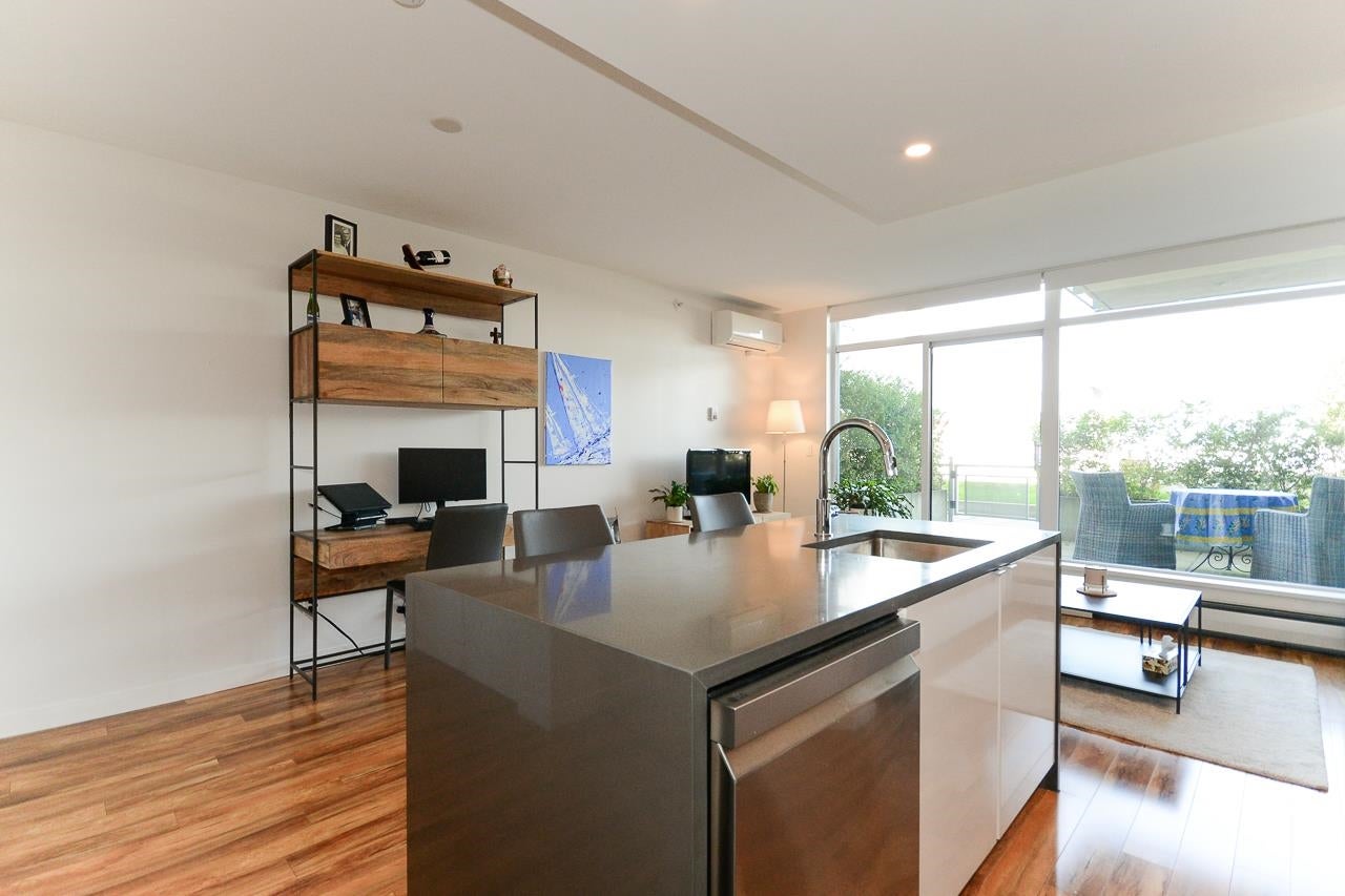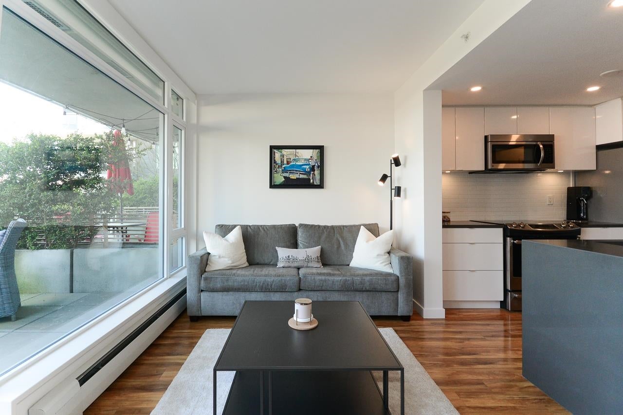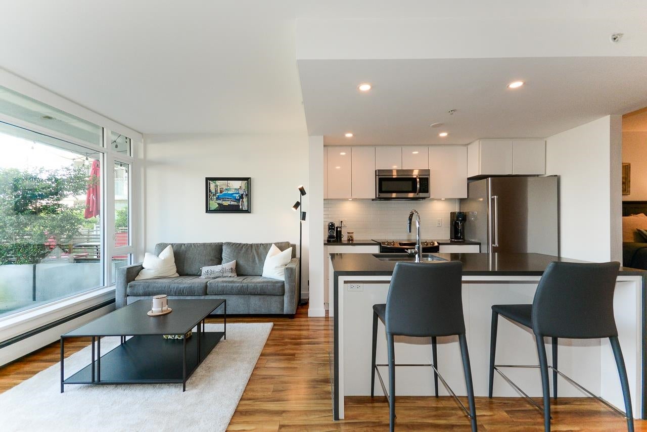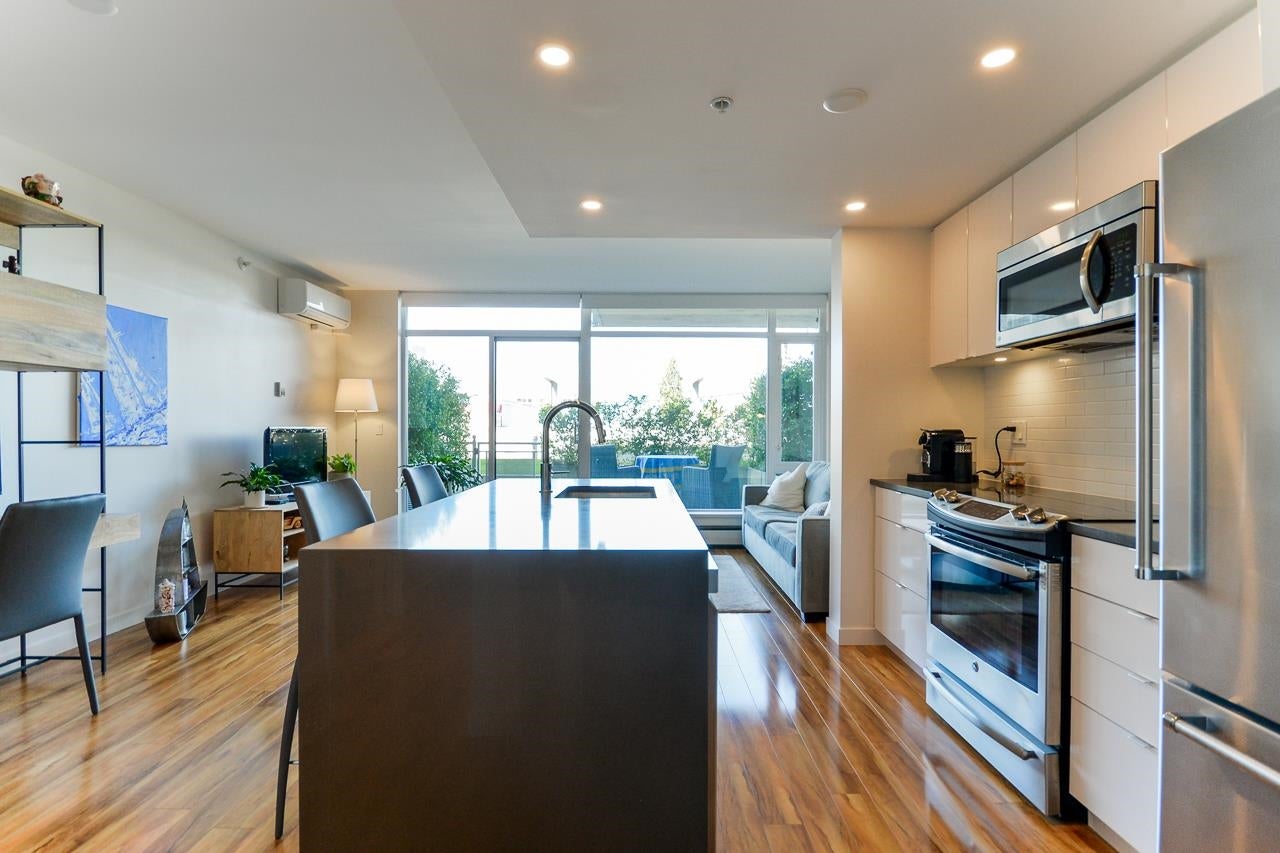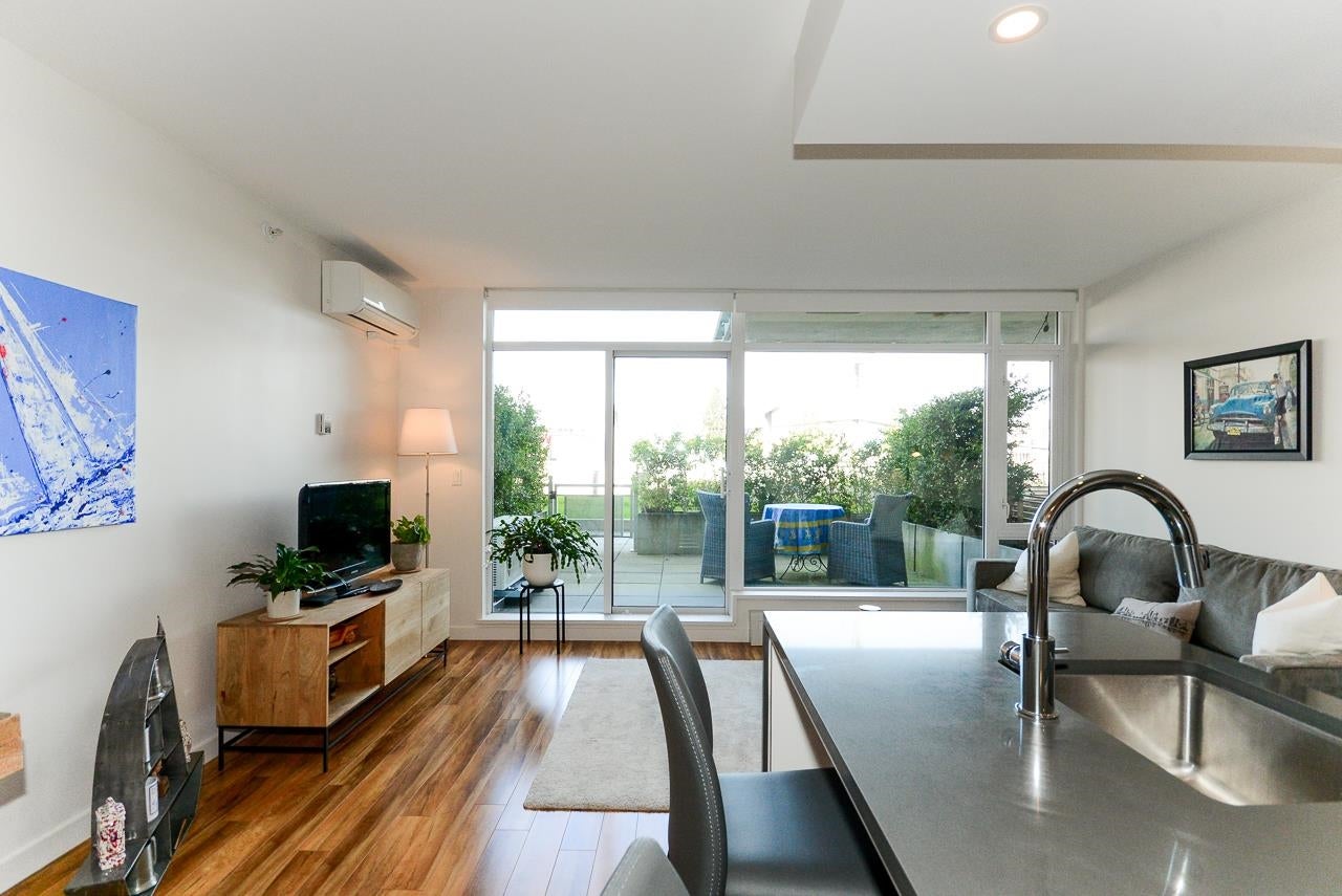 Great garden apartment in SHINE. This classy concrete low-rise is in the heart of Mount Pleasant with views of the North Shore Mountains. Nicer than new this spotless 1 bedroom boasts the "Great Room" living with a bright white kitchen, quartz counters, big island & wall to wall windows overlooking the private 175 sq. ft. patio. This outdoor space extends your living area and overlooks a secure garden. heat & hot water are included in the maintenance fee. There is a new refrigerator, remote control blinds & recently installed heat pump for A/C. This is one sweet suite!