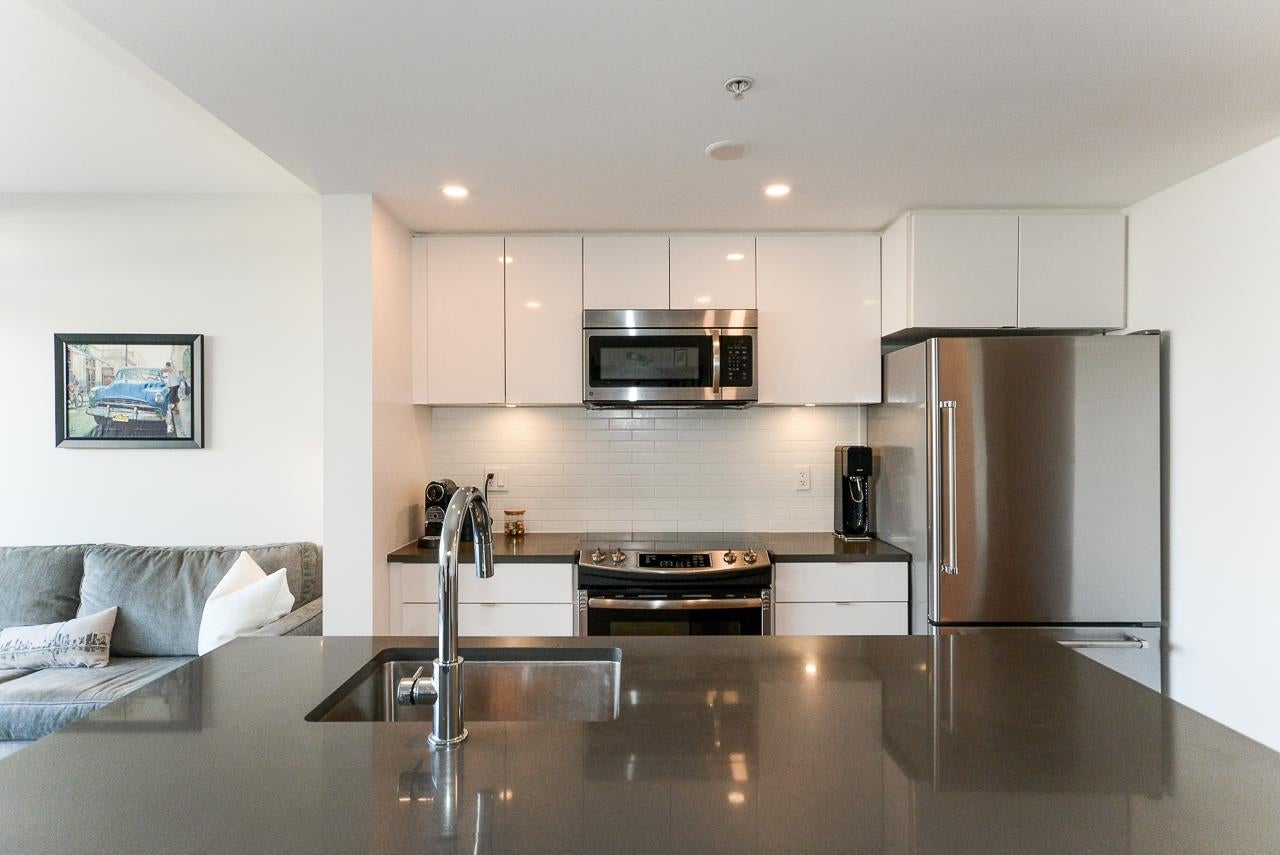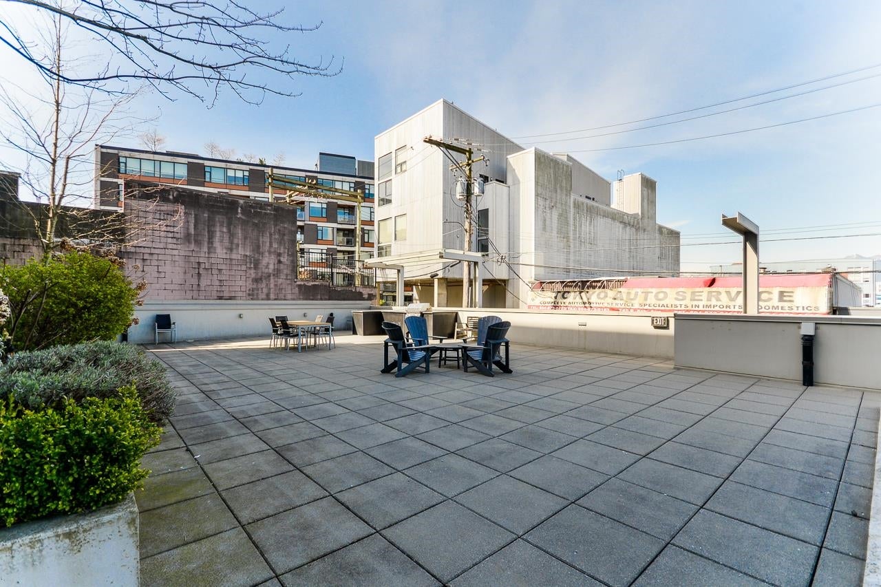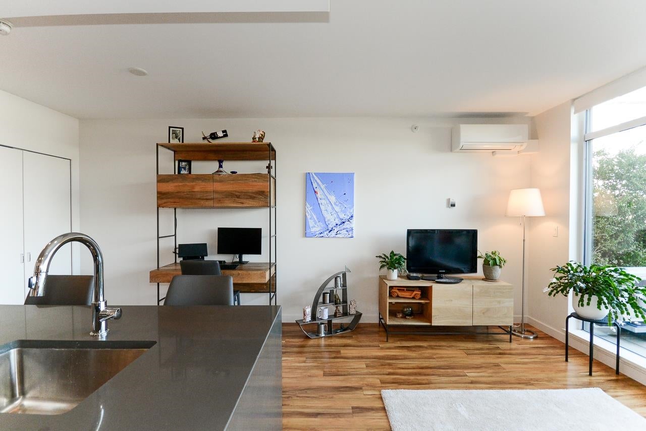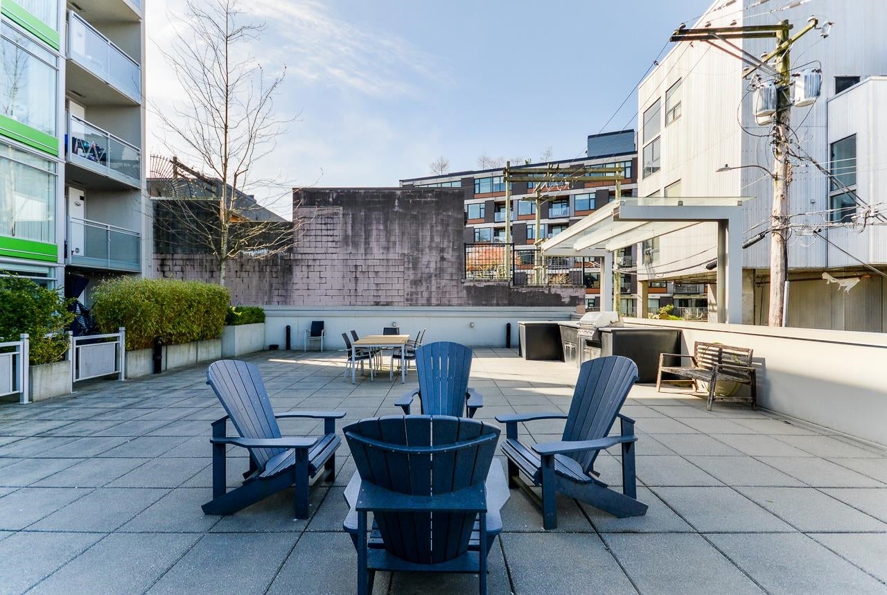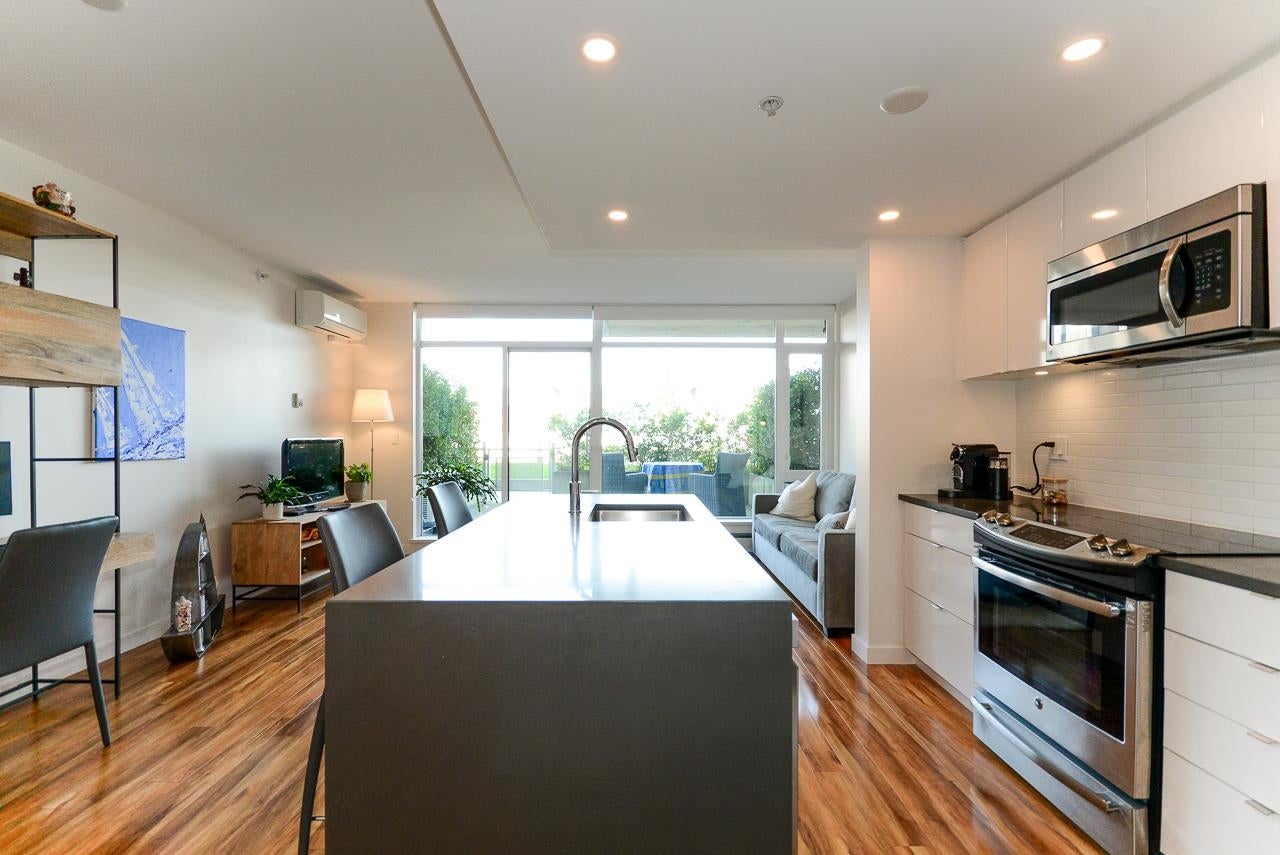 Great garden apartment in SHINE. This classy concrete low-rise is in the heart of Mount Pleasant with views of the North Shore Mountains. Nicer than new this spotless 1 bedroom boasts the "Great Room" living with a bright white kitchen, quartz counters, big island & wall to wall windows overlooking the private 175 sq. ft. patio. This outdoor space extends your living area and overlooks a secure garden. heat & hot water are included in the maintenance fee. There is a new refrigerator, remote control blinds & recently installed heat pump for A/C. This is one sweet suite!