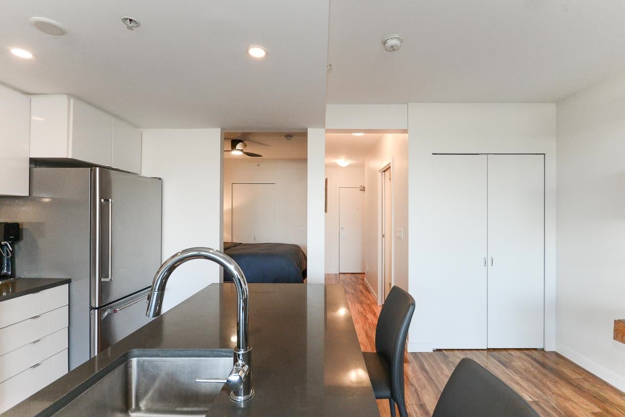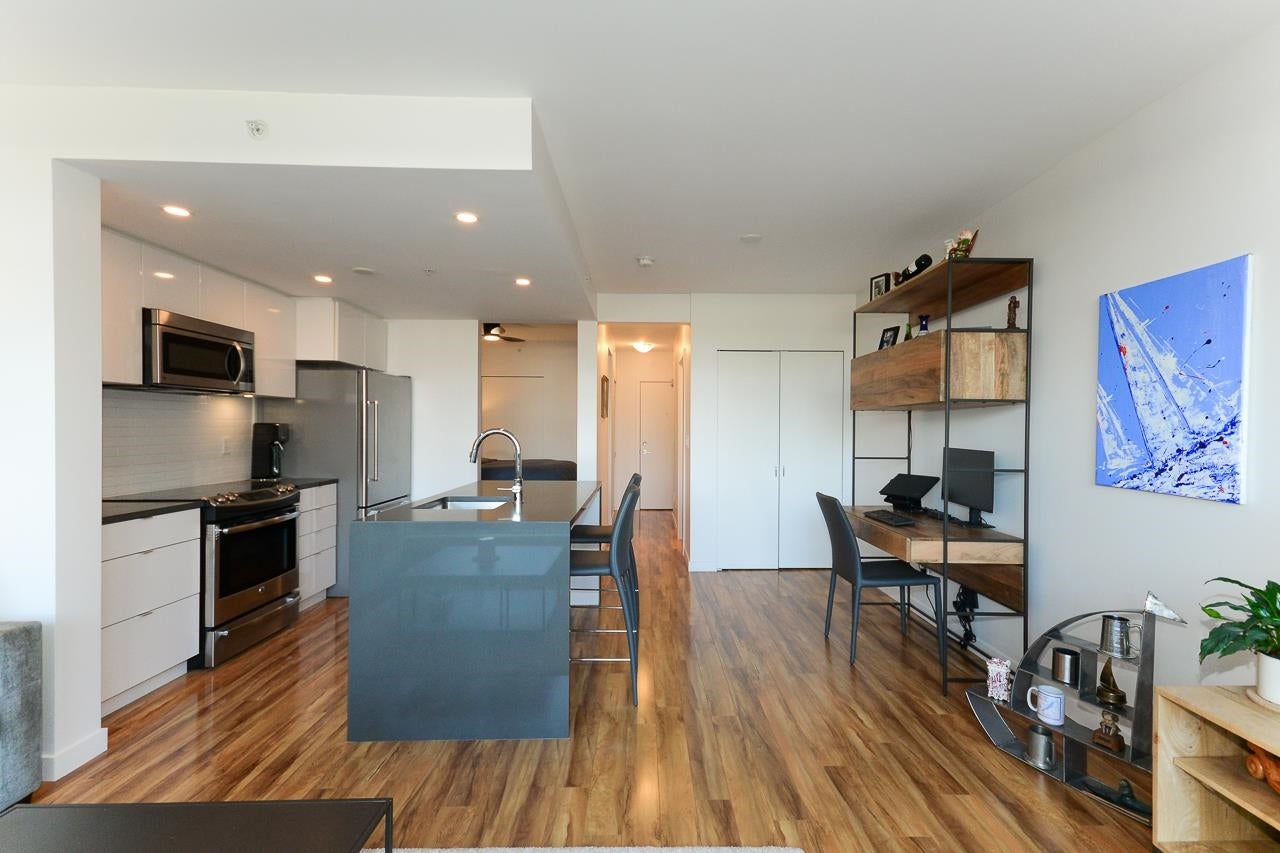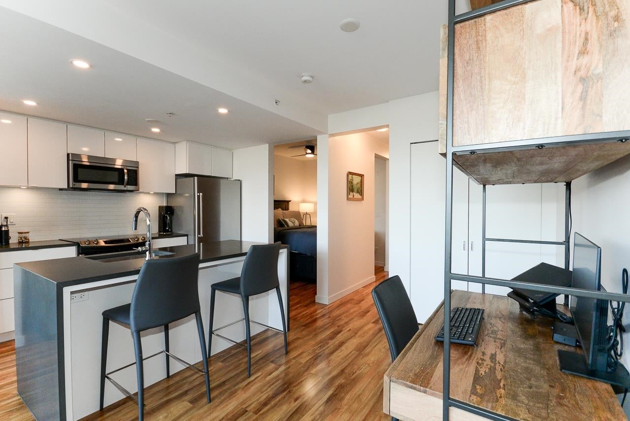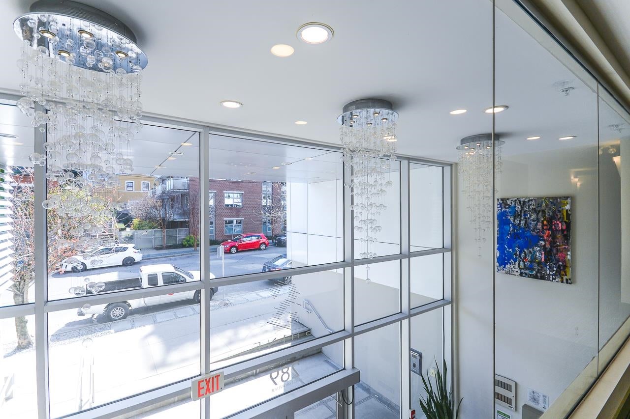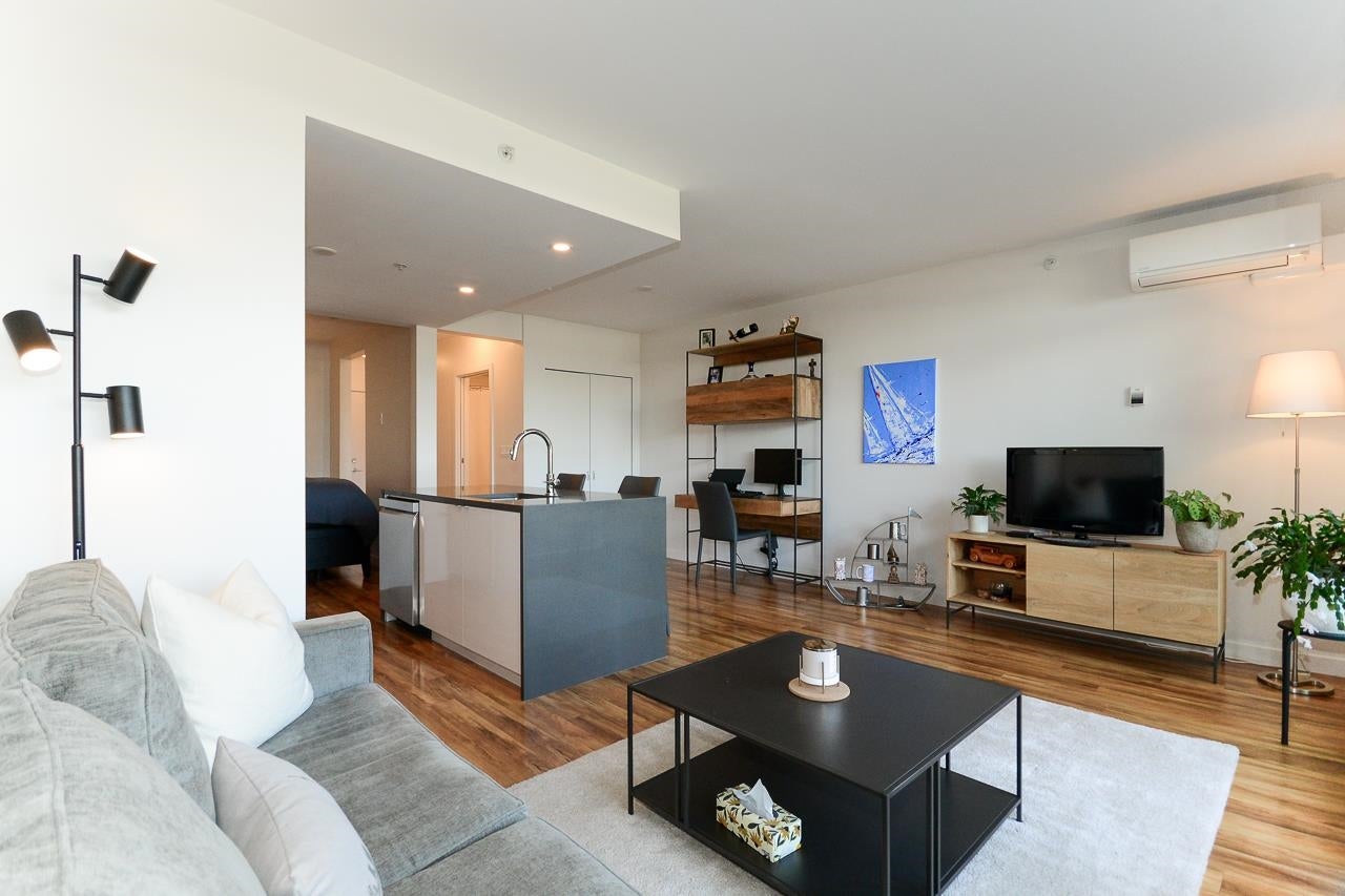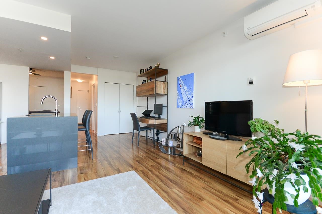 Great garden apartment in SHINE. This classy concrete low-rise is in the heart of Mount Pleasant with views of the North Shore Mountains. Nicer than new this spotless 1 bedroom boasts the "Great Room" living with a bright white kitchen, quartz counters, big island & wall to wall windows overlooking the private 175 sq. ft. patio. This outdoor space extends your living area and overlooks a secure garden. heat & hot water are included in the maintenance fee. There is a new refrigerator, remote control blinds & recently installed heat pump for A/C. This is one sweet suite!